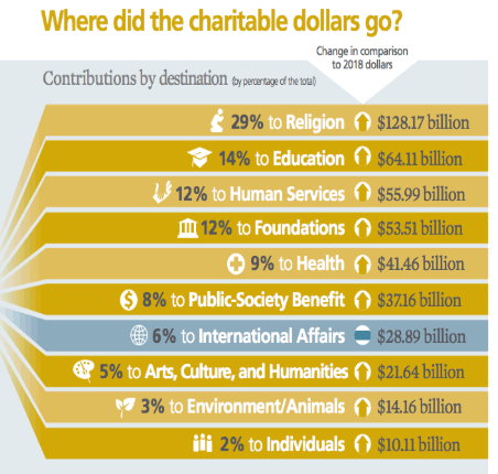 This came as a big surprise to me. Of all charitable program areas (excluding gifts to individuals) tracked by the Giving Institute, animal protection (and environmental preservation) programs have received the lowest share of U.S. donation dollars (typically around 3%) for many years running. In fact, that same trend can be seen in the 2019 data from the Giving Institute’s latest Giving USA report released this month (per an infographic from the report below).