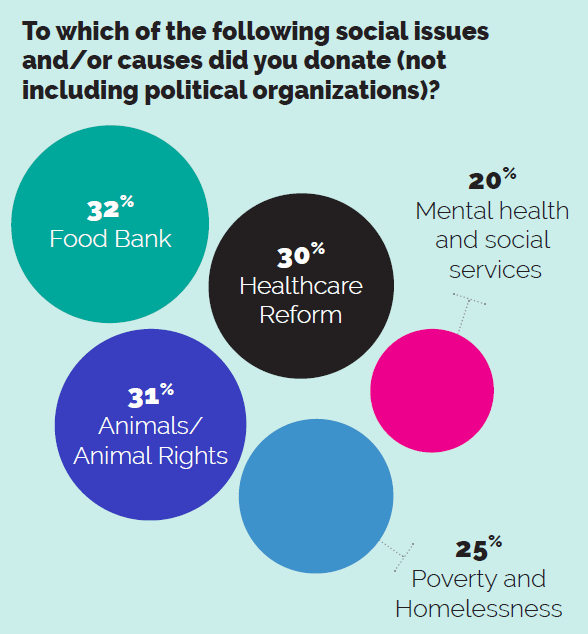 Since early March, the self-dubbed “[social] movement design studio” INFLUENCE|SG has issued a series of Cause and Social Influence reports based on survey data capturing engagement in various social issues among young Americans (aged 18-30) of different races, genders, education levels, employment statuses, and locations. The May installment of its Influencing Young America to Act research series — which was conducted prior to George Floyd’s murder — revealed that alongside healthcare advocacy groups and food pantries as top recipients of charitable donations, animal protection groups were also among the most popular, receiving 31% of charitable dollars from donors in the sample (per an infographic from the report below).