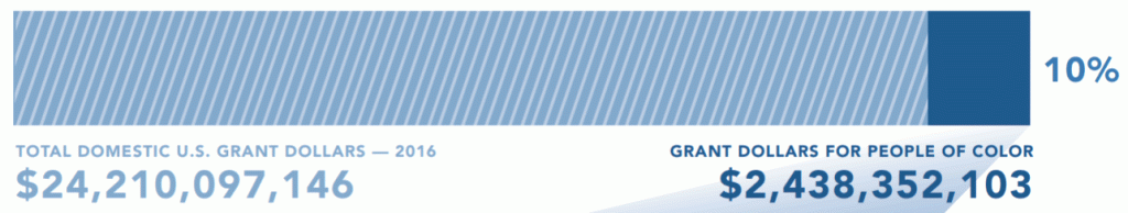 As the report points out, giving for these organizations represented a substantial increase relative to prior surveys. Furthermore, according to 2016 data from Candid (formerly the Foundation Center) and the Philanthropic Initiative for Racial Equity (PRE), only about 10% of giving by 1,000 of the largest U.S. foundations was explicitly directed to benefit people of color (per an infographic from the PRE report below).